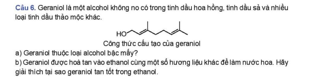 b, Geraniol là alcohol có gốc hydrocarbon dài, cồng kềnh nên geraniol tan kém trong nước (lực khuếch tán của gốc hydrocarbon lấn át liên kết hydrogen của nhóm hydroxyl), tan tốt trong dung môi hữu cơ như ethanol.