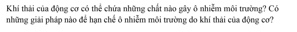 - Khí thải của động cơ có thể chứa nhiều chất gây ô nhiễm môi trường như: $CO, CO_2, SO_2, NO_2, PbO,...$