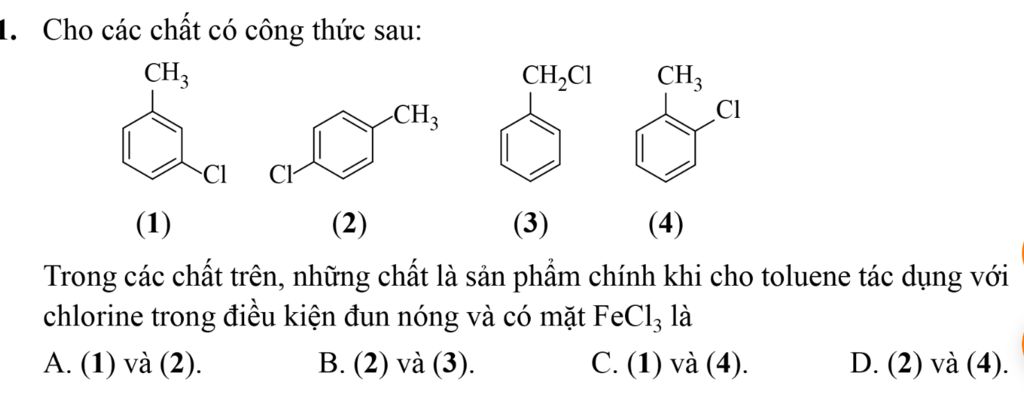 Khi xử lí toluene với $Cl_2$ có mặt Lewis acid như $FeCl_3$, phản ứng thế chlorine xảy ra trên vòng thơm (theo cơ chế thế ái điện tử $S_E$ do tác nhân tấn công là $Cl^+$).