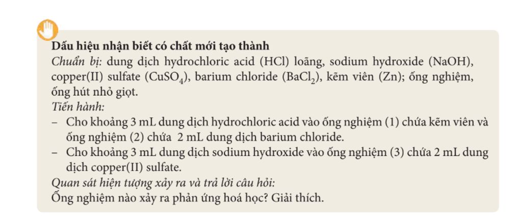 $\Rightarrow$ ống nghiệm (1) xảy ra phản ứng hoá học do tạo ra chất khí mới.