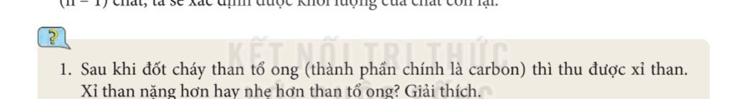 Phản ứng đốt cháy carbon trong than tổ ong có sự tham gia của oxygen trong không khí, tạo thành khí carbon dioxide bay lên. Do phản ứng làm chất rắn biến đổi thành chất khí nên khối lượng chất rắn giảm đi sau phản ứng. Xỉ than là chất rắn còn lại của phản ứng đốt cháy, do đó khối lượng xỉ than nhỏ hơn khối lượng than tổ ong. Vậy xỉ than nhẹ hơn than tổ ong.