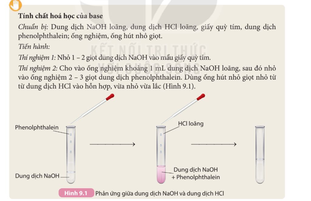 Dung dịch chuyển sang màu hồng sau khi nhỏ phenolphtalein vào dung dịch $NaOH$. Khi nhỏ từ từ dung dịch $HCl$ vào ống nghiệm và lắc đều, màu hồng của dung dịch nhạt dần rồi dung dịch chuyển thành không màu.