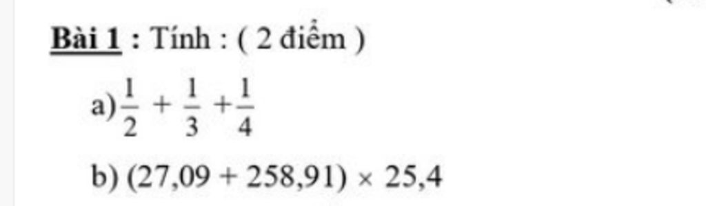 $a) \dfrac{1}{2}+\dfrac{1}{3}+\dfrac{1}{4}\\ =\dfrac{6}{12}+\dfrac{4}{12}+\dfrac{3}{12}\\ =\dfrac{6+4+3}{12}\\ =\dfrac{13}{12}\\ b) (27,09+258,91). 25,4\\ =286. 25,4\\ =7264,4.$