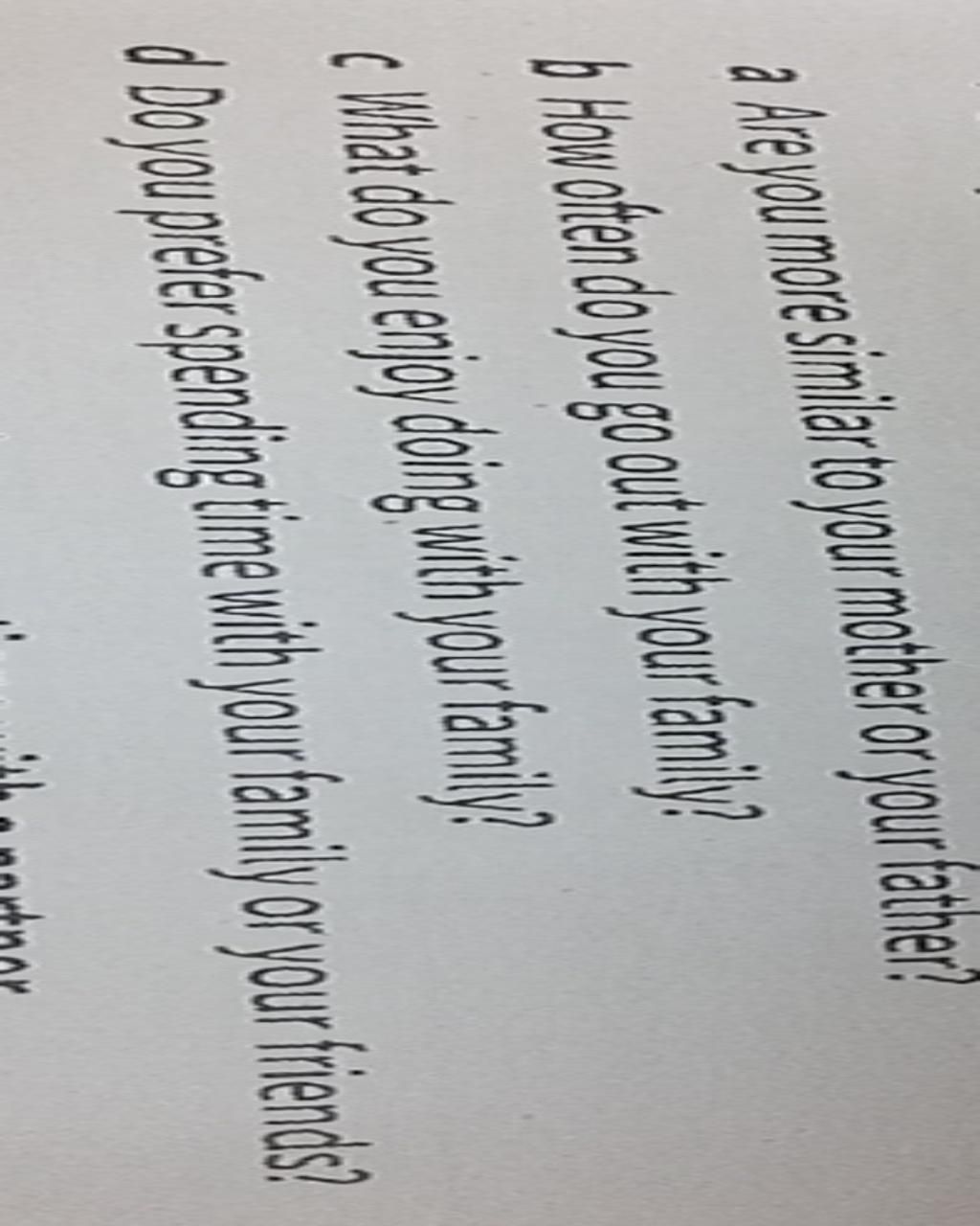 `@` I think I am more similar to my mother because we are both patient and caring. I often go out with my family at weekends, especially on Saturday evenings. We usually have dinner together or go to the park to relax. I enjoy talking, watching movies, and cooking simple meals with my family because it helps us understand each other better. Although I like spending time with my friends, I prefer spending time with my family. My family always supports me, and I feel safe and happy when I am with them.