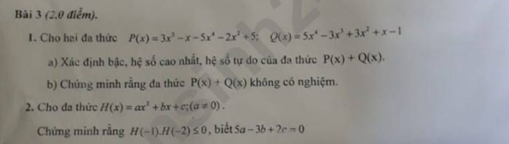 $2)\\ H(x)= ax^2 +bx+c (a \ne 0)\\ H(-1)=a.(-1)^2 +b.(-1)+c=a-b+c\\ H(-2)=a.(-2)^2 +b.(-2)+c=4a-2b+c\\ H(-1)+H(-2)= 5a - 3b + 2c = 0\\ \Rightarrow H(-1)=-H(-2)\\ H(-1).H(-2)=-H(-1)^2 \le 0 \ \forall x \ (đpcm).$
