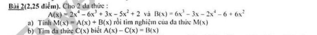$A(x) = 2x^4-6x^3 + 3x - 5x^2+2\\ B(x) = 6x^3 -3x-2x^4 - 6 + 6x^2\\ a) A(x) = 2x^4-6x^3 + 3x - 5x^2+2\\ = 2x^4-6x^3- 5x^2 + 3x +2\\ B(x) = 6x^3 -3x-2x^4 - 6 + 6x^2\\ =-2x^4 + 6x^3 + 6x^2-3x- 6 \\ M(x) = A(x) + B(x)\\ = 2x^4-6x^3- 5x^2 + 3x +2-2x^4 + 6x^3 + 6x^2-3x- 6 \\ =( 2x^4-2x^4)+ (6x^3-6x^3)+ (6x^2- 5x^2) + (3x-3x) +(2 - 6 )\\ =x^2-4\\ M(x)=0\\ \Rightarrow x^2-4=0\\ \Rightarrow x^2=4\\ \Rightarrow x=\pm 2$