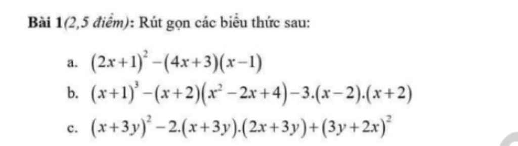 $a) (2x+1)^2-(4x+3)(x-1)\\ =(4x^2+4x+1)-(4 x^2 - x - 3)\\ =4x^2+4x+1-4 x^2 + x + 3\\ =5x+4\\ b) (x+1)^3-(x+2)(x^2-2x+4)-3(x-2)(x+2)\\ =(x^3+3x^2+3x+1)-(x^3+2^3)-3(x^2-2^2)\\ =x^3+3x^2+3x+1-x^3-8-3x^2+12\\ =3x+5\\ c) (x+3y)^2 -2.(x+3y).(2x+3y)+(3y+2x)^2\\ =(x+3y-3y-2x)^2\\ =(-x)^2\\ =x^2.$