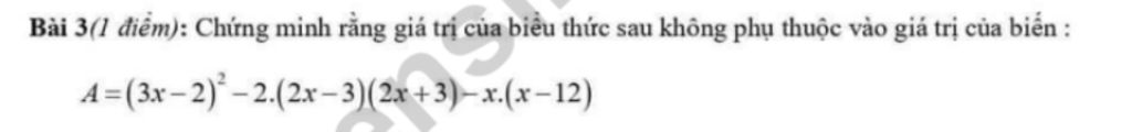 $A= (3x-2)^2-2(2x-3)(2x+3)-x(x-12)\\ =(9x^2-12x+4)-2(4x^2-9)-(x^2-12x)\\ =9x^2-12x+4-8x^2+18-x^2+12x\\ =(9x^2-8x^2-x^2)+(12x-12x)+(4+18)\\ =22$