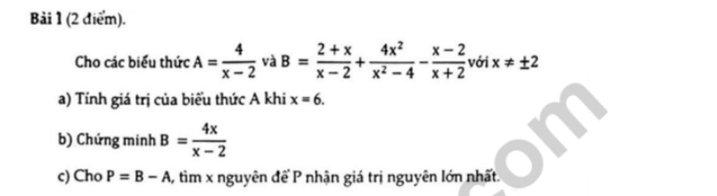 c) Ta có: `P = B - A = 4/(x-2) - (4x)/(x-2) = (4 - 4x)/(x-2) = (4 (x - 2) + 4)/(x-2) = 4 + 4/(x-2)`