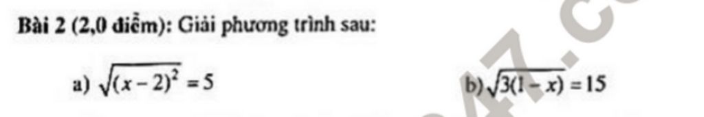 $\begin{array}{l} a)\,\sqrt {{{\left( {x - 2} \right)}^2}} = 5\\ \Leftrightarrow \left| {x - 2} \right| = 5\\ \Leftrightarrow \left[ \begin{array}{l} x - 2 = 5\\ x - 2 = - 5 \end{array} \right.\\ \Leftrightarrow \left[ \begin{array}{l} x = 7\\ x = - 3 \end{array} \right. \end{array}$