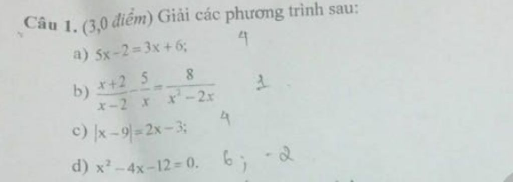 `b) ( x + 2 )/( x - 2 ) - 5/x = 8/( x^2 - 2x )` `dkxd:` $\begin{cases} x \ne 0\\x \ne 2 \end{cases}$