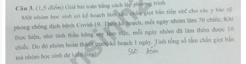 Vậy tổng số tấm chắn giọt bắn theo dự kiến làm là `: 560` chiếc