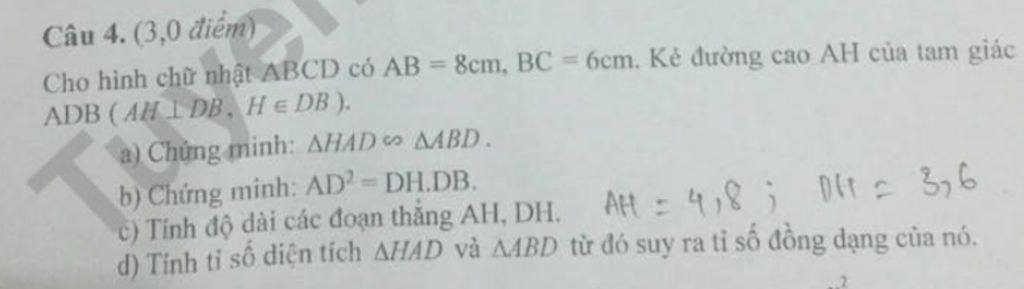 `d) ( S_{ \triangle AHD } )/( S_{ \triangle ABD } ) = 0,36cm^2;`Tỉ số đồng dạng `= 0,6(cm)`