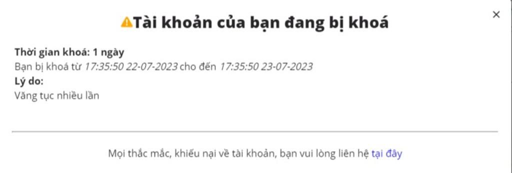 Bạn bị khoá từ 17:35:50 22-07-2023 cho đến 17:35:50 23-07-2023