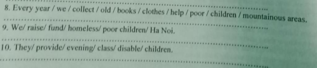`8`. Every year we collect old books and clothes to help the poor children in the mountainous areas.