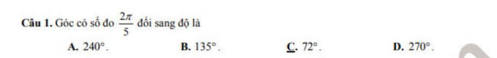 $\dfrac{2\pi}{5}$ `=` $\dfrac{2\pi}{5}$ `.` $\dfrac{180}{\pi}$ `=` $72^o$