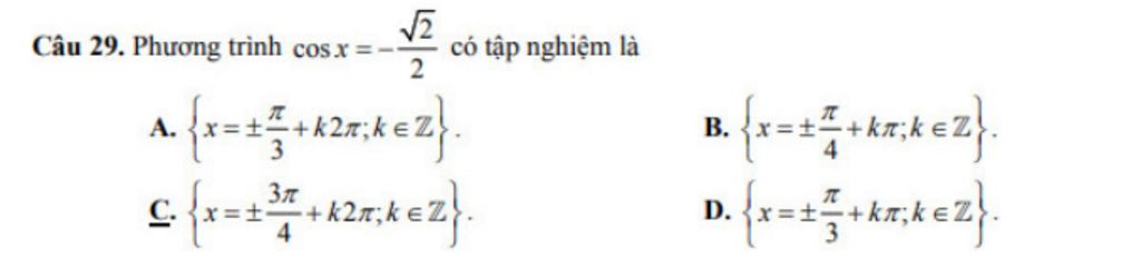 `=>` `cosx=-sqrt2/2` `<=>` $\left[\begin{matrix} x= \arccos\left(-\dfrac{\sqrt{2}}{2}\right)+k2\pi \ (k \in \mathbb{Z}) \\ x =-\arccos\left(-\dfrac{\sqrt{2}}{2}\right)+k2\pi \ (k \in \mathbb{Z}) \end{matrix}\right.$