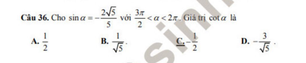 `=>` `cotalpha=(cosalpha)/(sinalpha)=((sqrt5)/5)/(-(2sqrt5)/5)=-1/2`