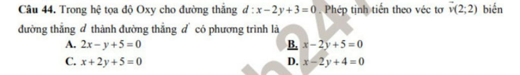Câu 44. Trong hệ tọa độ Oxy cho đường thẳng d :x−2y+3=0 . Phép tịnh tiến theo véc tơ v(2;2) biến đường thẳng d thành đường thẳng d có phương trình là