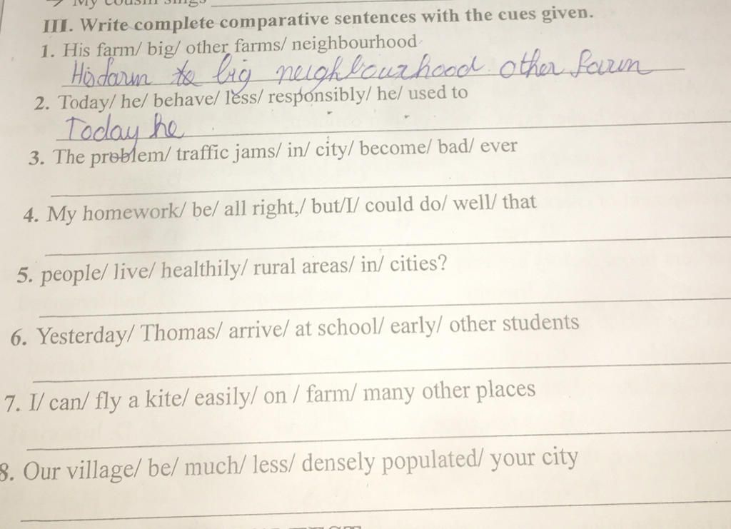 III. Write complete comparative sentences with the cues given.