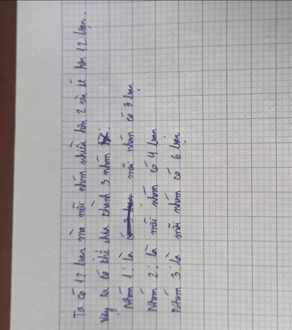 Một tổ có 12 bạn chia thành các nhóm để lao động . Số học sinh mỗi nhóm nhiều hơn 2 bạn và ít hơn 12 bạn . Hỏi có thể chia thành mấy nhóm , mỗi nhóm có mấy bạn?
