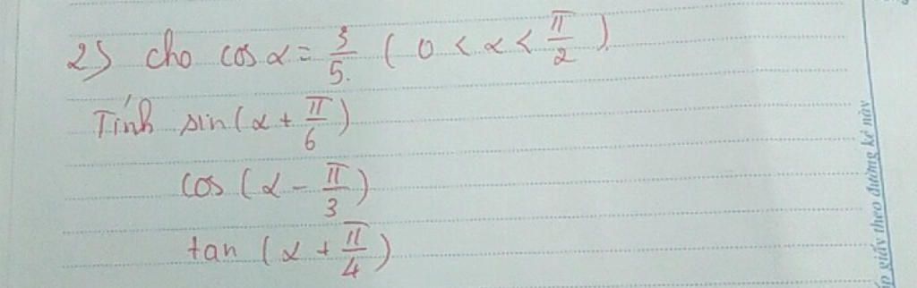 Vì $0<\alpha<\dfrac{\pi}{2}$ nên $\sin\alpha > 0 ⇒ \sin\alpha = \dfrac{4}{5}$