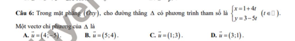 Đường thẳng `triangle` đi qua `M(-1;3)` và có vectơ chỉ phương `vecu = (4;-2)`