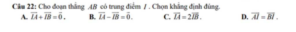 Câu 22: Cho đoạn thẳng AB có trung điểm I . Chọn khẳng định đúng.