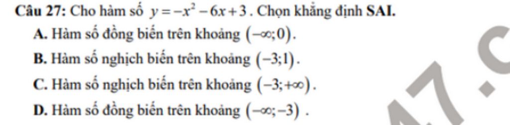 Câu 27: Cho hàm số $y=-x^2−6x+3$.Chọn khẳng định SAI.
