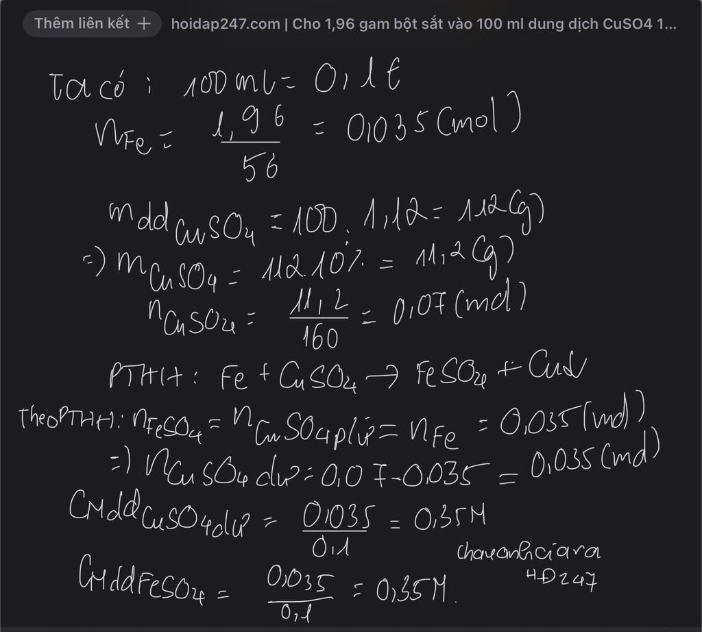 Cho 1,96 gam bột sắt vào 100 ml dung dịch CuSO4 10% (khối lượng riêng là 1,12 g/ml).