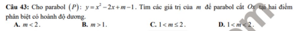 `(P)` cắt `Ox` tại hai điểm phân biệt có hoành độ dương