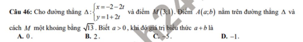 Ta có: `Delta: \ {(x=-2-2t),(y=1+2t):}` `=>` `Delta: \ x+y+1=0`