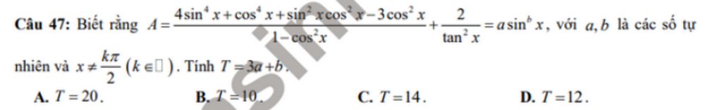`A=(4sin^4x+cos^4x+sin^2xcos^2x-3cos^2x)/(1-cos^2x)+2/(tan^2x)`