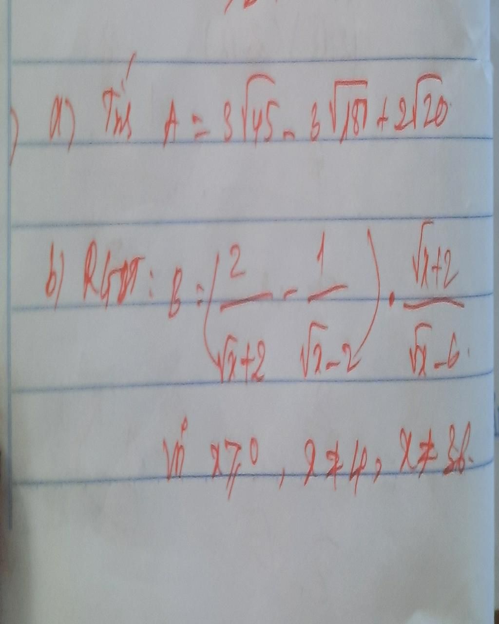 `B= (2\sqrt{x}-4 - \sqrt{x}-2)/((\sqrt{x}-2)(\sqrt{x}+2)) .(\sqrt{x}+2)/(\sqrt{x}-6)`
