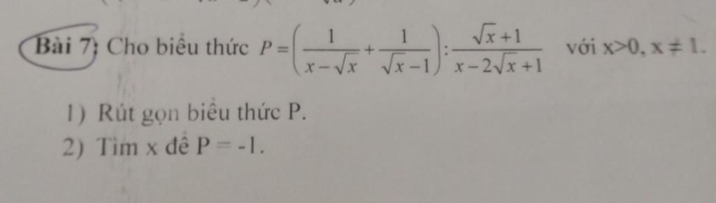 `P=(1/(x-sqrtx)+1/(sqrtx-1)):(sqrtx+1)/(x-2sqrtx+1)`
