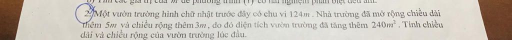 2 Một vườn trường hình chữ nhật trước đây có chu vi 124m . Nhà trường đã mở rộng chiều dài