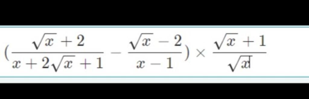 `=[((sqrtx+2)(sqrtx-1))/((x-1)(sqrtx+1))-((sqrtx-2)(sqrtx+1))/((x-1)(sqrtx+1))]*(sqrtx+1)/(sqrtx)`