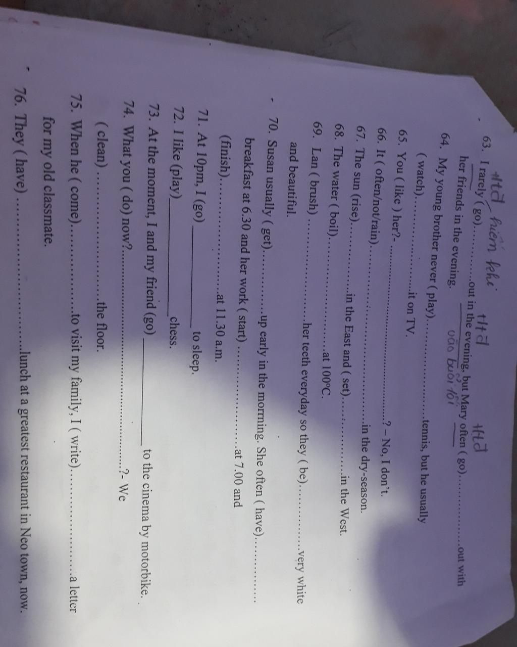 Trả lời rồi giải thích chi tiết cho từng câu,câu 63 tại sao dùng go-goes mà k dùng go hết,ví dụ dị đó,mọi người giúp em với