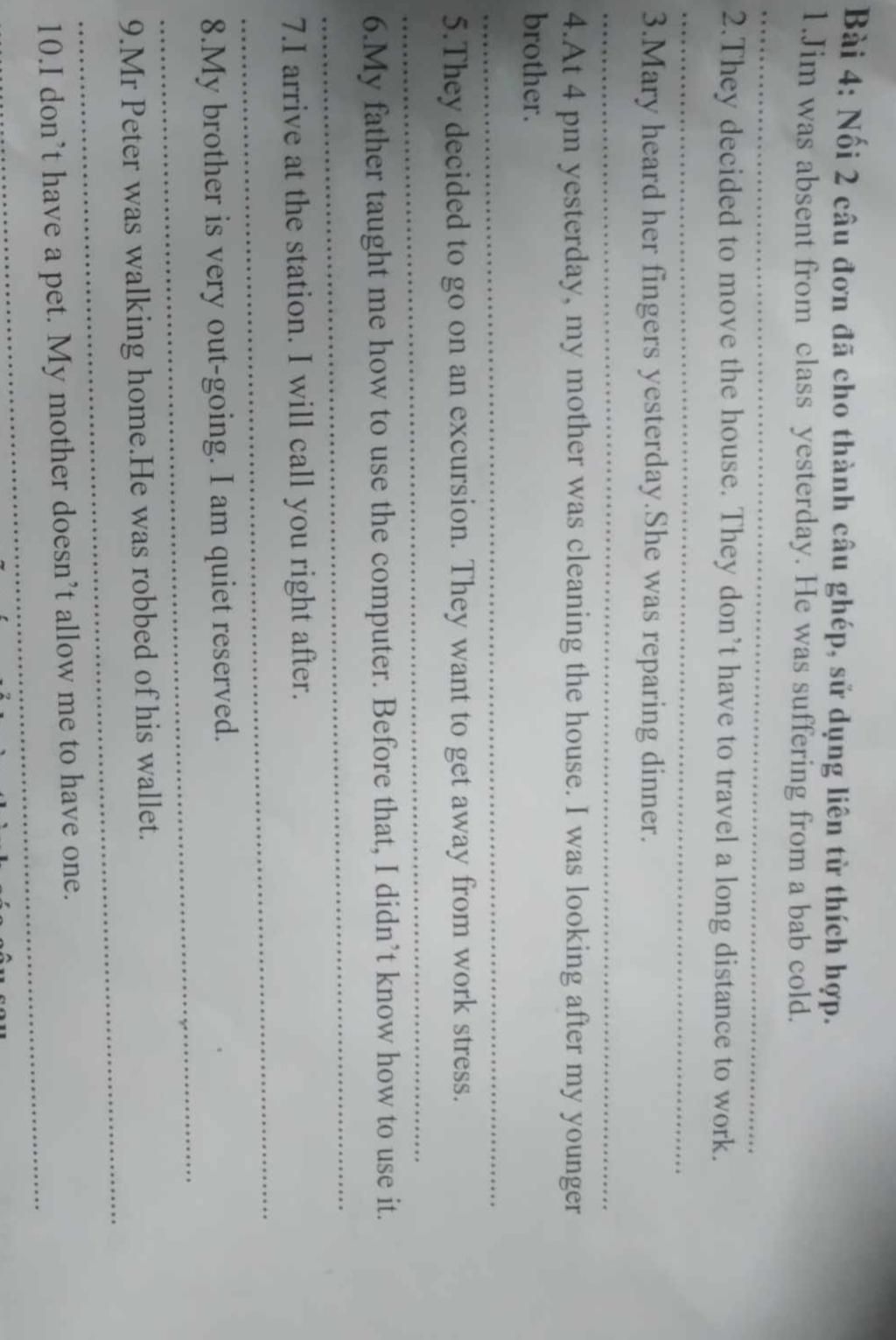 Bài 4: Nối 2 câu đơn đã cho thành câu ghép, sử dụng liên từ thích hợp.