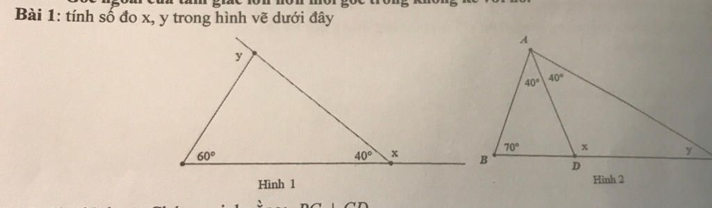 $y=60^o+40^o=100^o$(Góc ngoài tại một đỉnh bằng tổng hai góc trong khác đỉnh đó của tam giác)