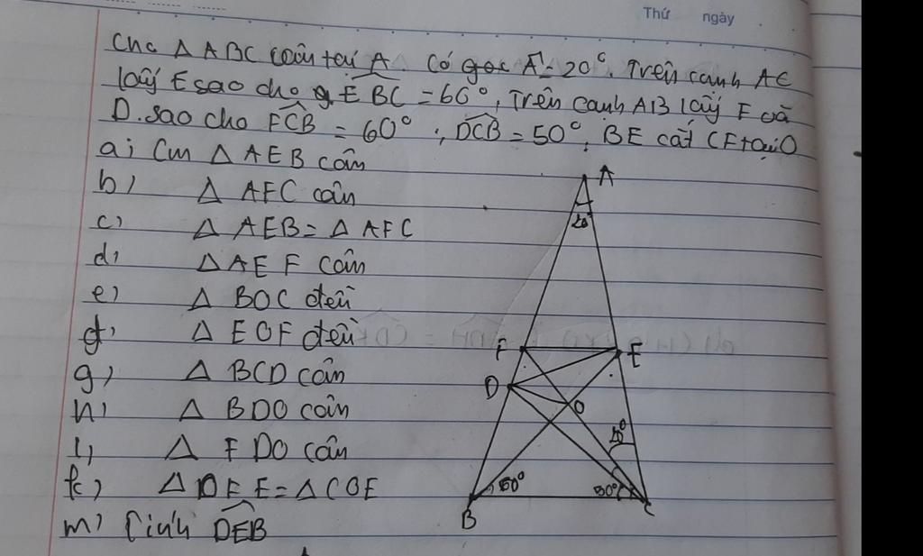 Cho AABC câu tại A có gọi Á 20°. Trên cạnh AC