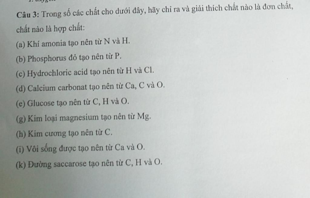 h, Kim cương là đơn chất vì chỉ có mình nguyên tố C.