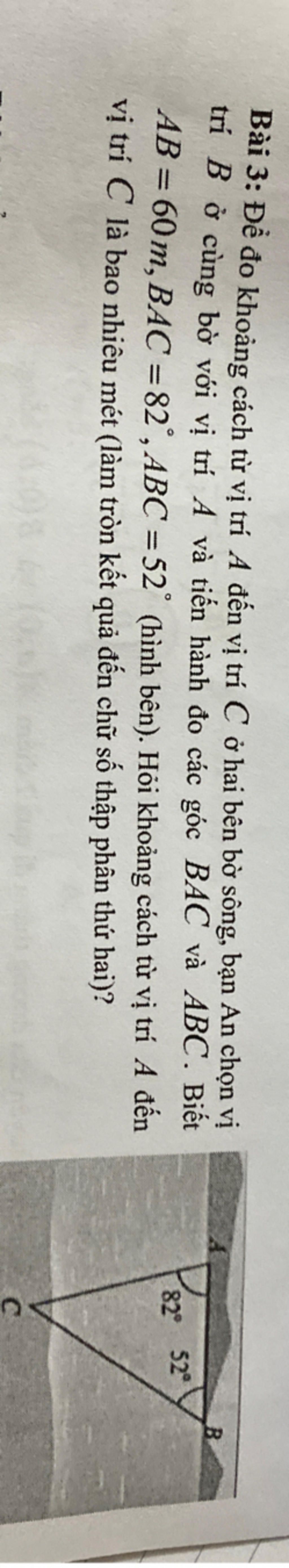 AB = 60m, BAC =82°, ABC =52° (hình bên). Hỏi khoảng cách từ vị trí 4 đến