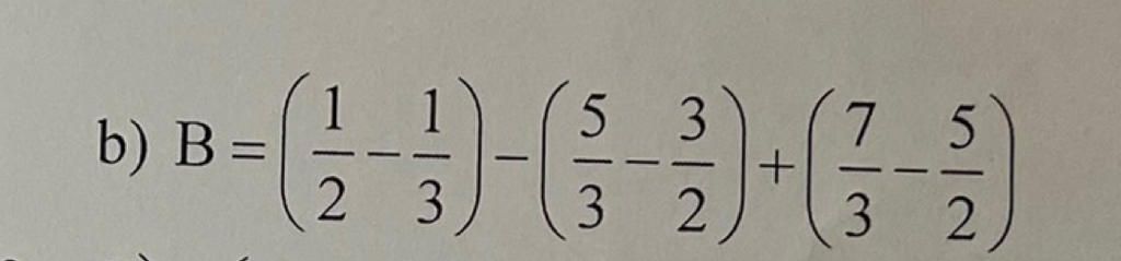 b) B=($\frac{1}{2}$ -$\frac{1}{3}$ )-($\frac{5}{3}$ -$\frac{3}{2}$ )+( $\frac{7}{3}$ -$\frac{5}{2}$ )