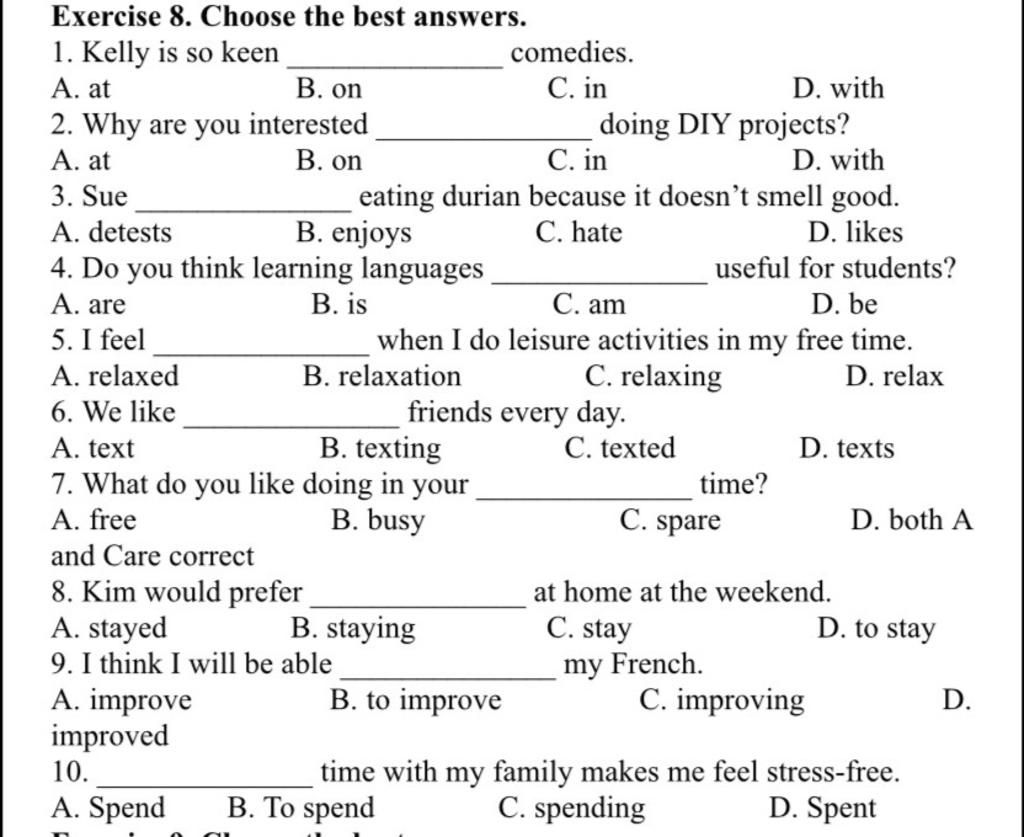 3. A - Detest doing sth: ghét làm gì - Sue (chủ ngữ số ít) -> thêm "s/es"