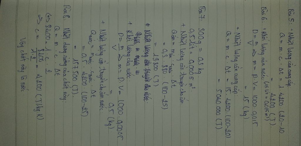 \Rightarrow c = \frac{Q}{{m\Delta t}} = \frac{{8400}}{{1.2}} = 4200J/kg.K