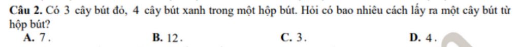`3` cây bút đỏ `+4` cây bút xanh `=7` cây bút `<=>7` cách lấy