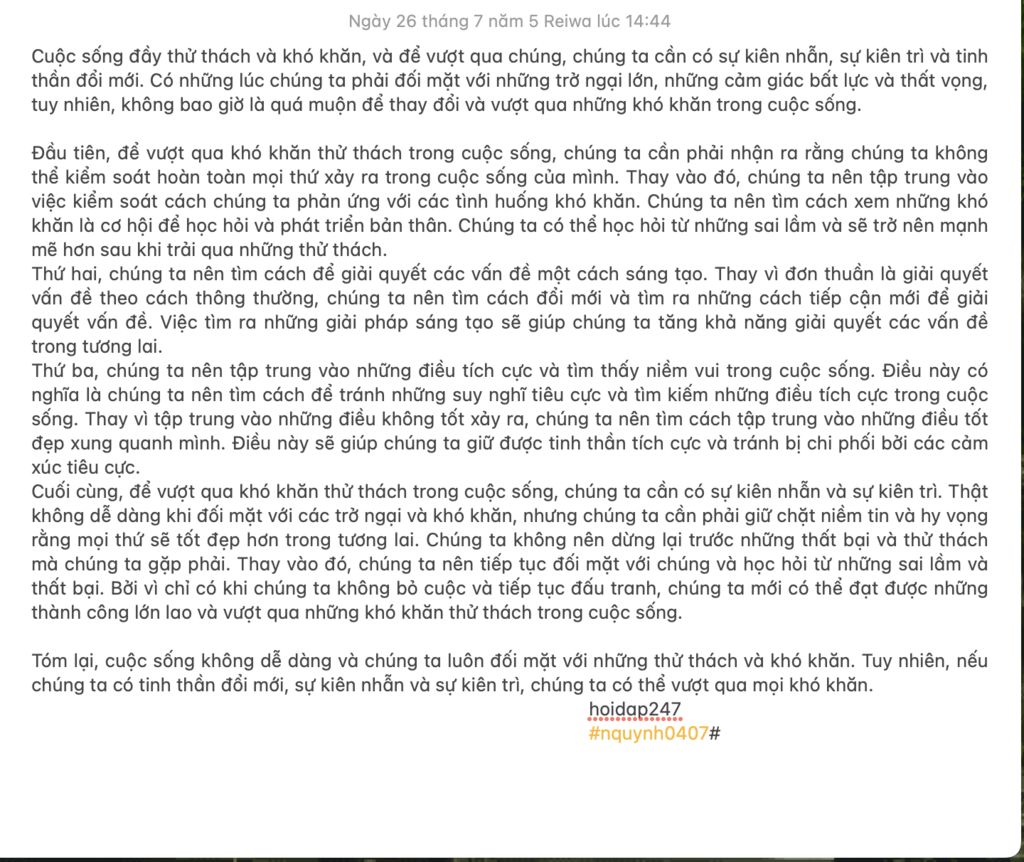 Cuộc sống vốn là nơi để con người rèn dũa bản thân,nếu đã sống thì không thể tránh khỏi khó khăn đó như bài kiểm tra bắt buộc phải làm vậy.Tuy khó khăn là nhiều như thế nhưng nó giúp ta hiểu những bài học quý giá trong cuộc sống.Nhiều người cho rằng khi ta gặp khó khăn là điềm xấu sau đó trốn tránh khó khăn k dám đối đầu với thử thách.Nhưng bạn biết không?Khó khăn không hẳn là xấu bởi sau mỗi khó khăn ta đều trường thành thêm chút,học được những bài học quý giá những kĩ năng đó tôi luyện ta trở thành một người đầy bản lĩnh.Tôi biết sẽ chẳng dễ dàng gì để vượt qua khó khăn nhưng nếu ta không thử thì làm sao ta có thể biết?Thay vì trốn tránh thực tại rút bản thân trong góc phòng.Hay dùng những phương pháp cực đoan để giải thoát bản thân khỏi những đau khổ,khó khăn.Cuộc sống sẽ đẹp biết bao khi bạn học được cách dũng cảm đối mặt với khó khăn.Để vượt qua khó khăn thử thách trong cuộc sống, chúng ta cần có sự kiên nhẫn và sức chịu đựng bền bỉ.Chẳng dể dàng gì khi phải đối mặt với các trở ngại trong cuộc sống.Nhưng chúng ta cần phải giữ niềm tin và hy vọng mãnh liệt rằng mọi thứ rồi cũng sẽ tốt đẹp hơn trong tương lai.Cũng giống như câu"Sau cơn mưa trời cũng sáng"sao? Chúng ta không nên chùn bước trước những thất bại và thử thách mà chúng ta gặp phải. Thay vào đó, chúng ta phải tiếp tục dũng cảm đối mặt với khó khăn.Chúng cần học hỏi từ những sai lầm và thất bại.Bởi không có sự thành công nào là ngẫu nhiên cũng không có sự nỗ lực nào là uổng phí!!Trong cuộc sống vỗn có nhiều nhiều khó khăn quan trọng là ta vượt qua chúng như thế nào.Hãy luôn lạc quan vượt qua những khó khăn cậu nhé!
