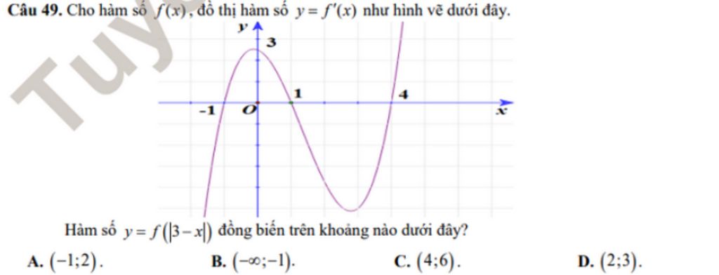 Hàm số y = f (|3−x|) đồng biến trên khoảng nào dưới đây?