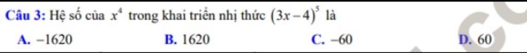 `=>` Hệ số của `x^4` trong khai triển là: `C_5^1*3^(5-1)*(-4)^1=-1620`